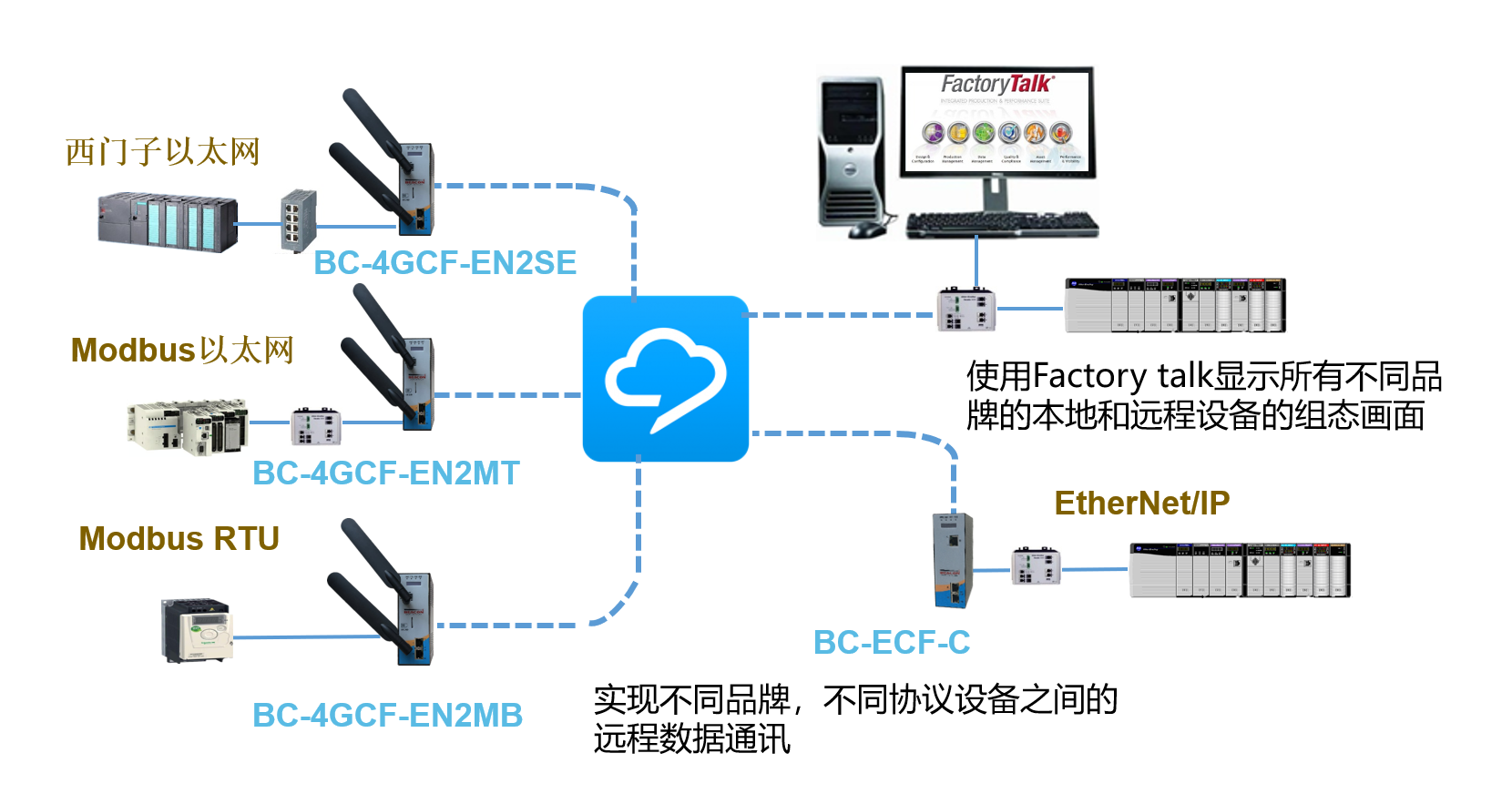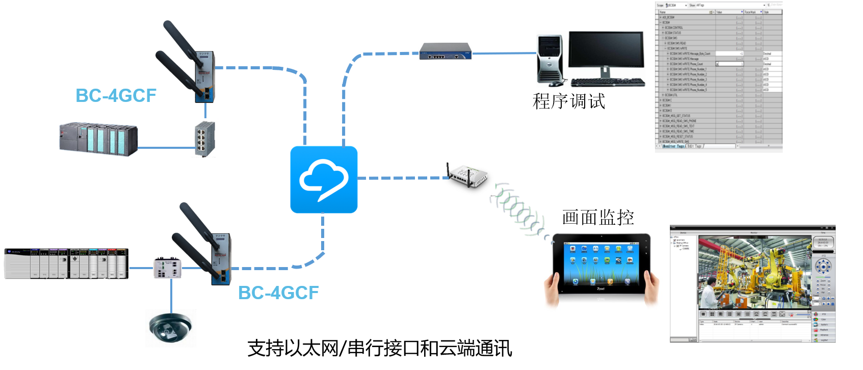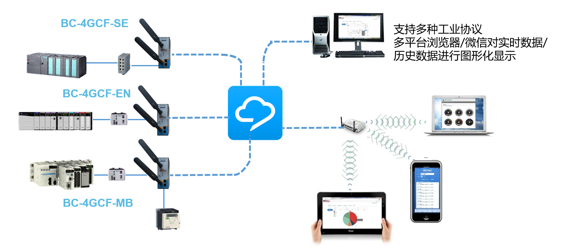 BC-4GCF系列产品内置多种工业协议,可以直接和现场各类PLC,DCS,仪表进行连接,支持多种工作模式: