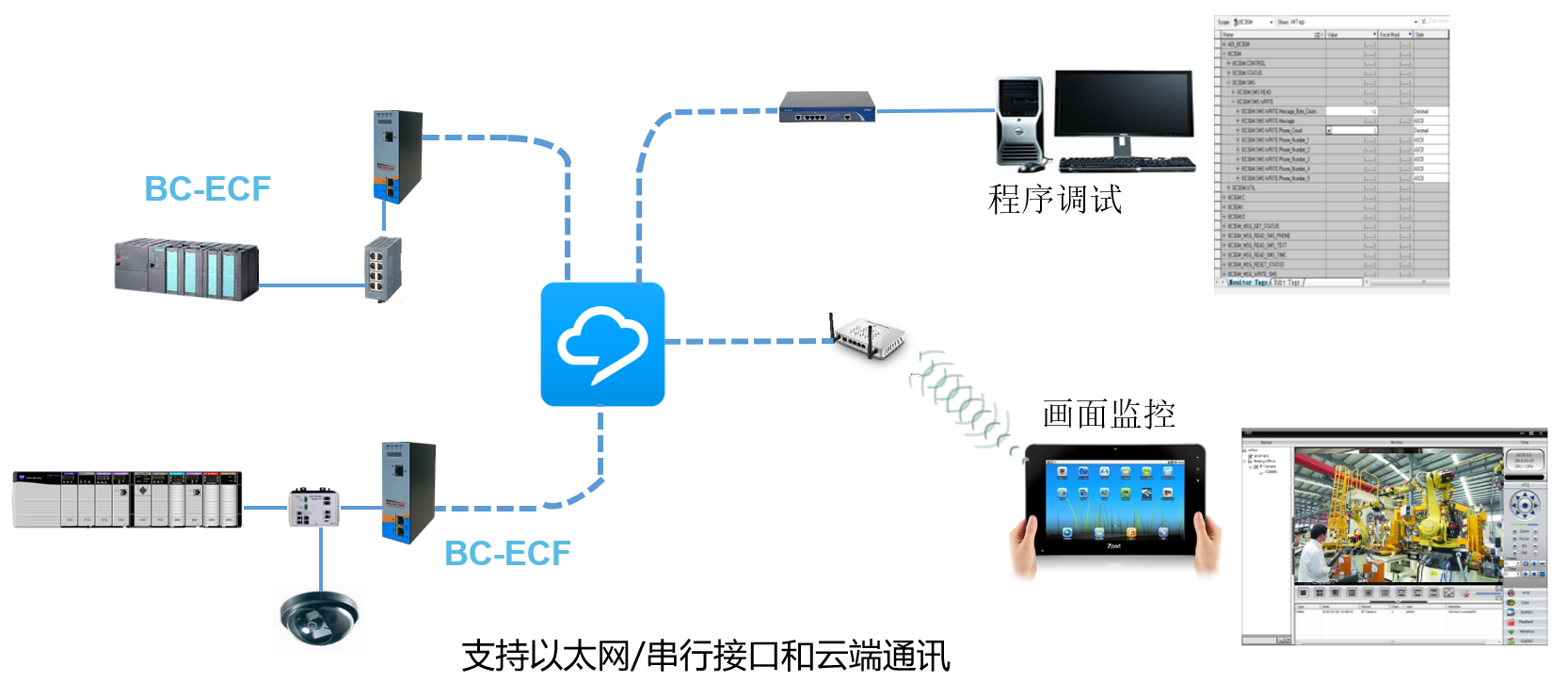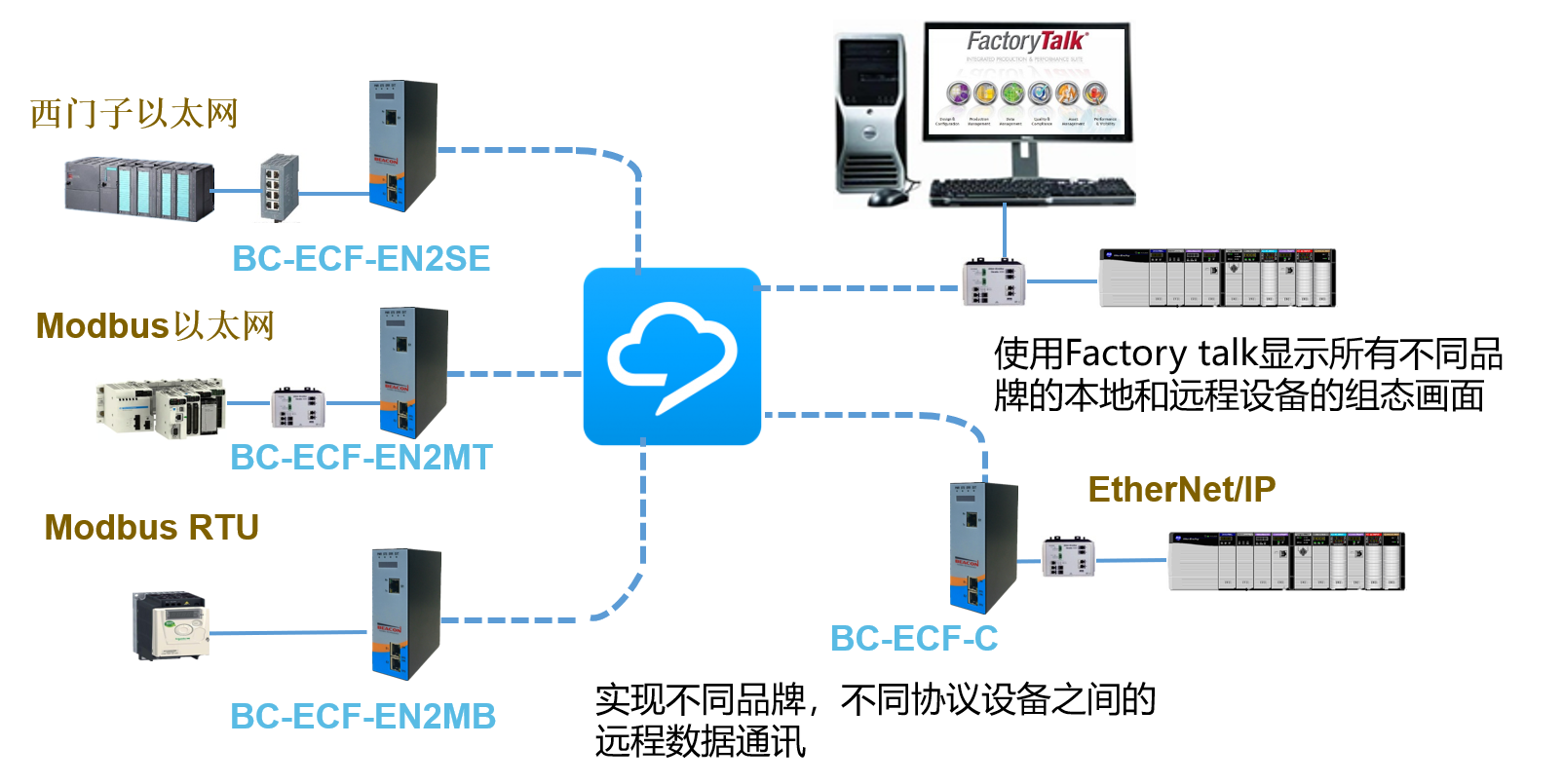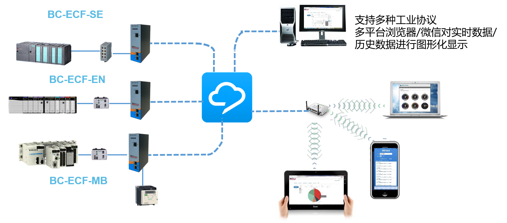 BC-ECF系列产品内置多种工业协议,可以直接和现场各类PLC,DCS,仪表进行连接,支持多种工作模式: