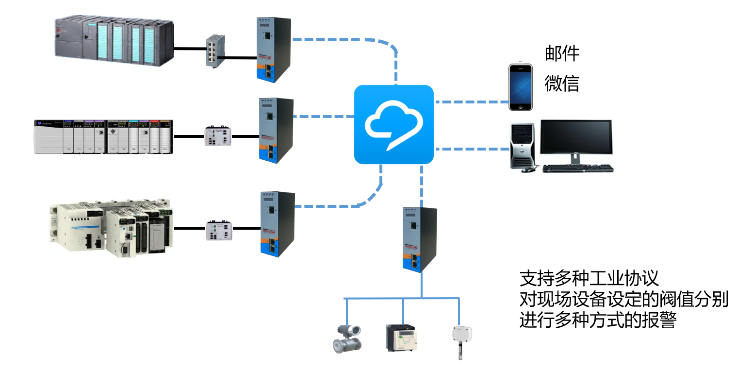 2) 多平台的数据监控模式:通过各种工业协议对现场采集到的数据进行标签自定义,并对这些标签进行报警阀值设定,数据逻辑运算。同时无需第三方组态软件和编程软件,实现各种终端(包括PC端,手机端,平板端)采用浏览器或者微信对实时数据/历史数据进行图形化显示,并且无需启动VPN的情况下,可对历史数据进行云端存储(支持用户本地下载)以及趋势图显示。同时还支持不同终端采用MQTT的APP对实时数据进行监视