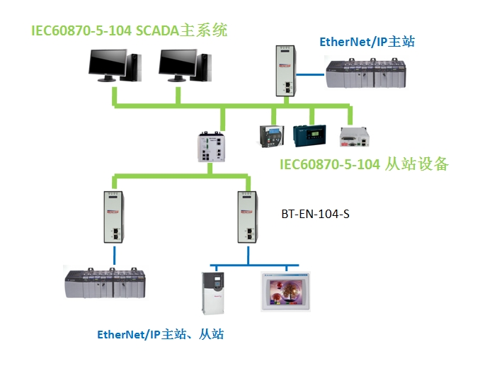 网关提供一个EtherNet/IP以太网端口以及一个IEC 60870-5-104以太网端口分别和PLC或者其他以太网设备(HMI、变频器、操作员站等)以及具有IEC 104接口的IED设备或者SCADA主站进行通信,两种以太网可以选择设置在同一个网段或者不同网段。
