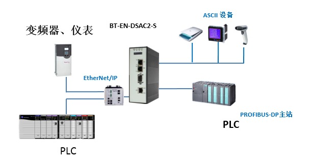 网关提供一个 EtherNet/IP以太网端口,2个ASCII串行端口,以及一个Profibus-DP端口分别和PLC或者其他以太网设备(HMI、变频器、操作员站等),ASCII设备,以及Profibus-DP主站进行通信。
