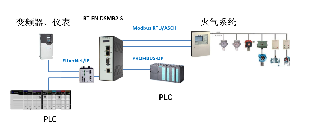 网关提供一个EtherNet/IP以太网端口,2个Modbus串行端口,以及一个Profibus-DP端口分别和PLC或者其他以太网设备(HMI、变频器、操作员站等),Modbus主从站设备,以及Profibus-DP主站进行通信。