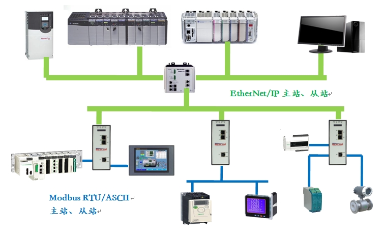可提供1,2,4个RS-232/422/485 Modbus RTU串行通信端口,每个端口可以根据要求配置成Modbus主站或者从站。网关提供一个EtherNet/IP以太网端口和PLC或者其他以太网设备(HMI、变频器、操作员站等)进行通信,EtherNet/IP一端同时可以最多支持作为15个客户端和15个服务器,每个客户端最大支持128条指令,指令总数最多可达1920条。