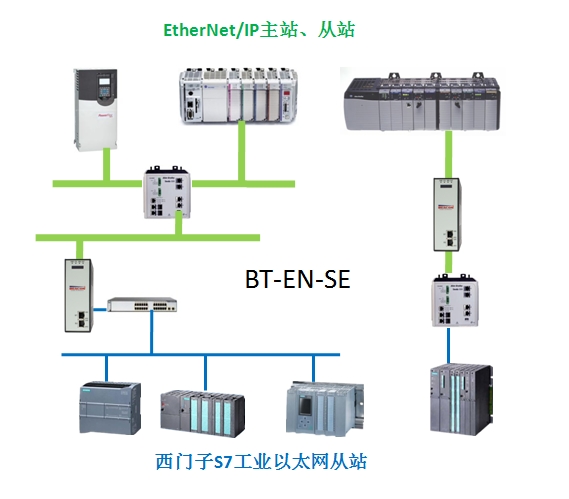 网关提供一个EtherNet/IP以太网端口以及一个西门子S7工业以太网端口分别和PLC或者其他以太网设备(HMI、变频器、操作员站等)进行通信,两种以太网可以选择设置在同一个网段或者不同网段。