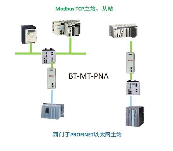 网关提供一个Modbus TCP以太网端口以及一个PROFINET(RT)以太网端口分别和PLC或者其他以太网设备(HMI、变频器、操作员站等)进行通信,两种以太网可以选择设置在同一个网段或者不同网段。