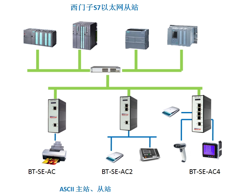Beacon Global Technology旗下西门子 S7 以太网-Generic ASCII串行通讯网关模块BT-SE-ACx,支持在西门子S7 以太网和Generic ASCII串行网络中的设备之间的双向数据交换,最大8,000个字节数据交换区。