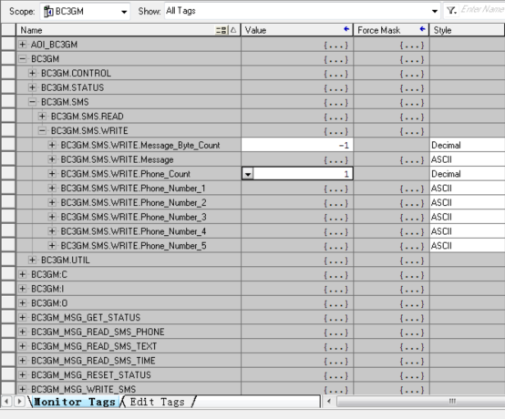 该空调厂家采用了AB 1769控制系统以及Beacon Global Technology公司的BC-3GM蜂窝电台来实现该功能。对于机组运行的所有控制参数由PLC负责采集,之后PLC可以选择30个最为重要的报警信息,通过在程序中将报警阀值作为触发条件通过EtherNet/IP 驱动发送至BC-3GM,BC-3GM可以发送中英文短消息至指定的维护工程师。