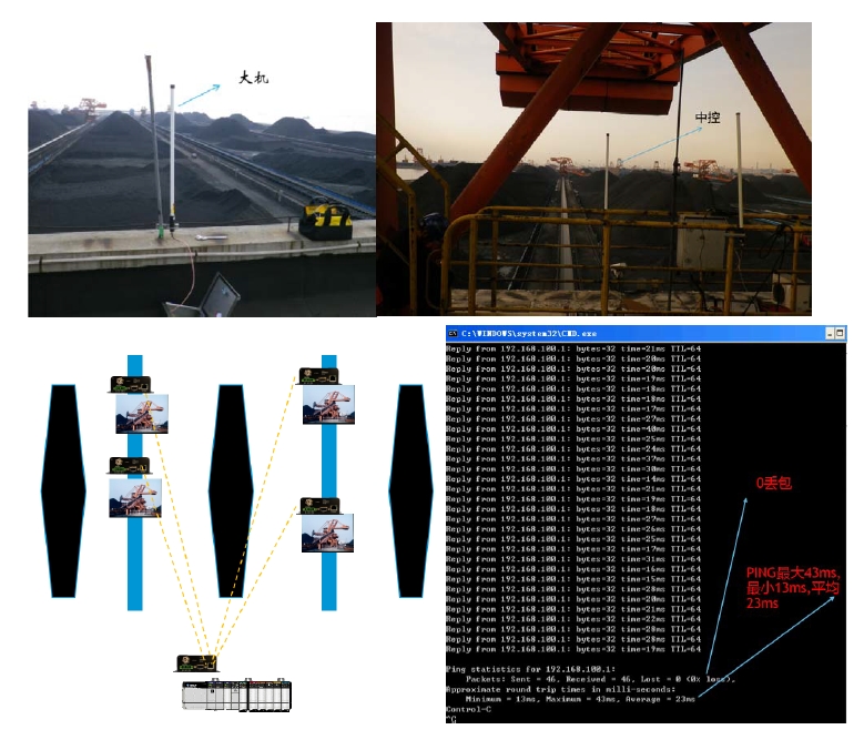 1)现场可视的条件较差,电台的天线架设于大机操作员室的顶部,当大机转动的情况下,操作员室顶部的天线容易被大机本身的钢结构所遮挡,造成无线信号衰减。2)在中控室1 个主站同时和4 台大机通讯的情况下,用户对于实时性的要求比较高,不希望控制信号出现延时。