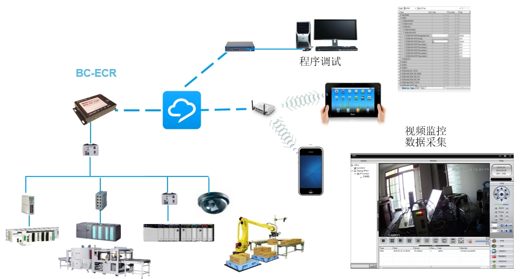 3) 同类远程维护装置,某些只能绑定一个PLC 设备的地址,如果在同一个网络下有多个PLC 或者摄像头,则无法查看其它设备的数据。而BC-ECR-B 可以监控同一个网段下的每个设备,节省了用户的投资。