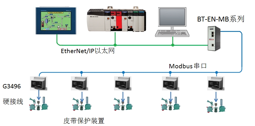 现场 跑偏、打滑、拉绳、堵溜槽、烟温的点进入到G3496模块里,该模块集成DI输入DO输出和MODBUS RTU从站功能,再通过Beacon Global Technology的BT-EN-MB网关作为MODBUS RTU主站连接多个G3496模块再传输到AB的EtherNet/IP网络里,生成标签来监控皮带的各种状态。本项目在皮带保护系统上应用效果表明,皮带保护应用MODBUS网络连接稳定可靠,这种组网方式结构简单,应用方便,减少了现场大量的控制电缆及I/O模块,减少了施工成本和施工时间。BT-EN-MB网关数据交换区最大可达10000个字,串行端口可选择不同数量最多可达4个端口,这样可以同一个网关同时连接多个G3496模块,大大减少了用户采购网关的成本。