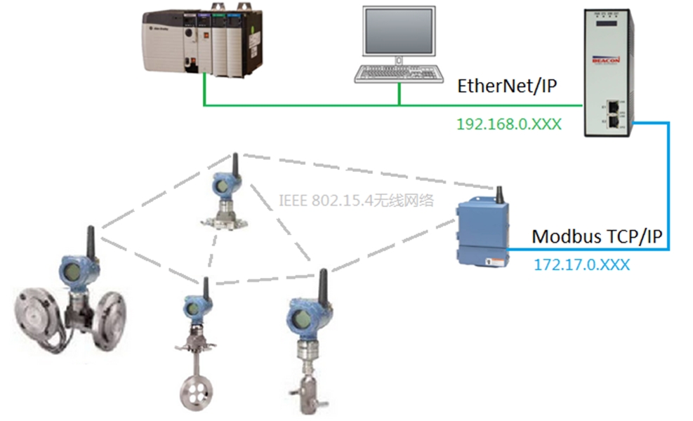 1420无线网关是无线设备和现有控制系统之间的接口,连接方式主要有Modbus RS485,Modbus TCP/IP。改造后的除灰控制系统PLC中没有空余的RS485接口,因此本方案采用Modbus TCP/IP通讯方式。